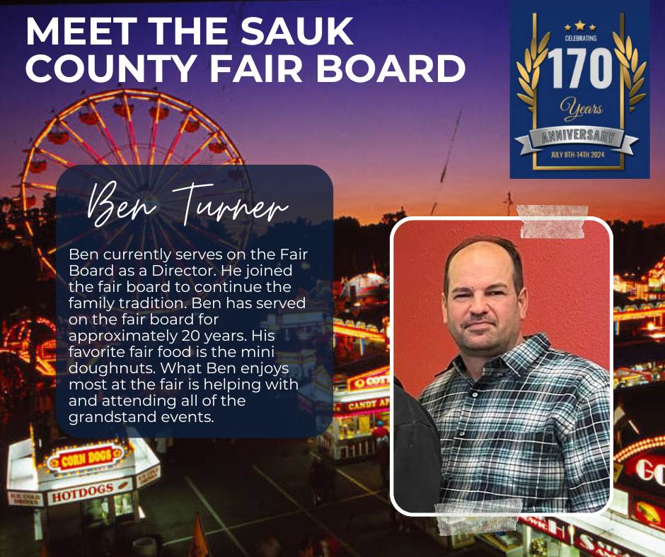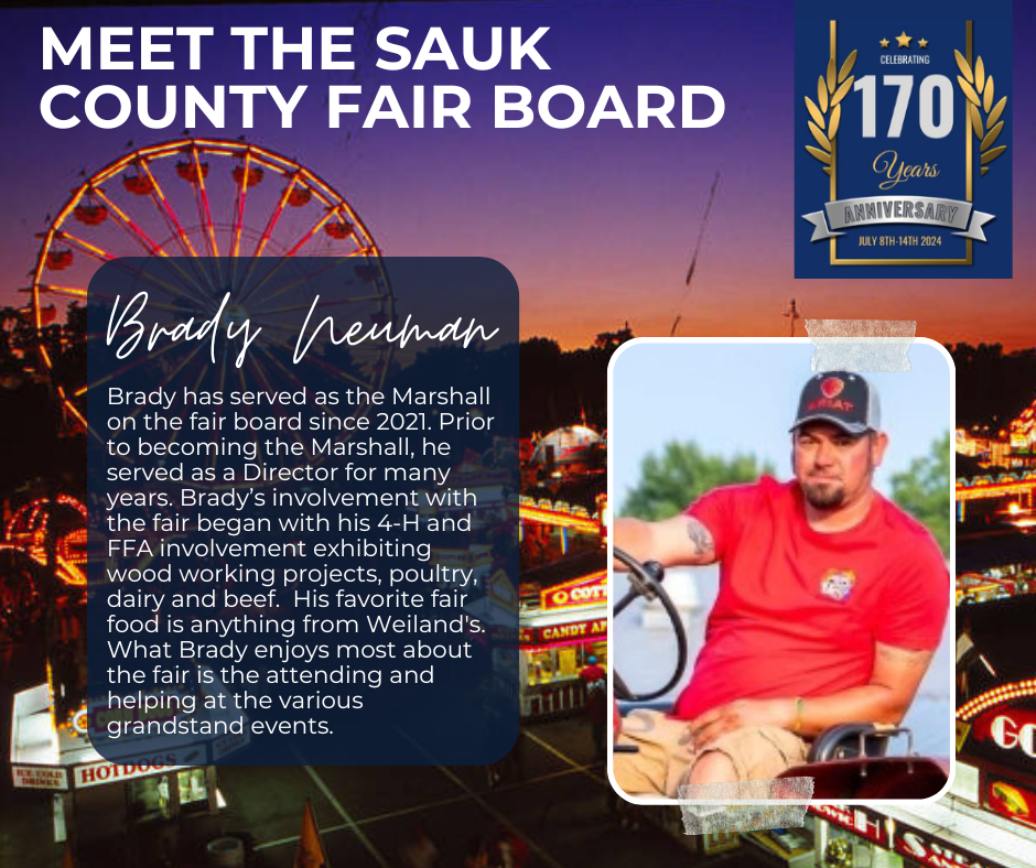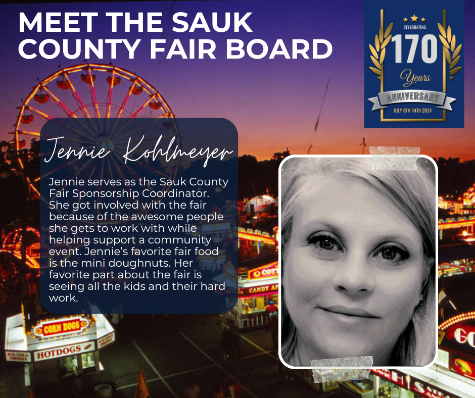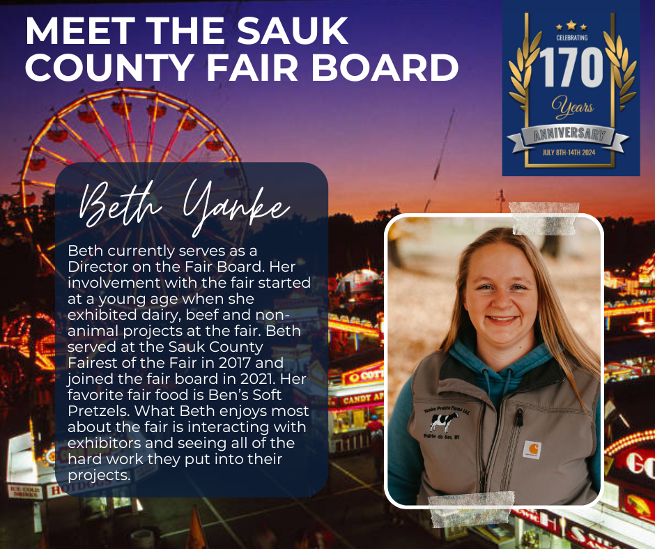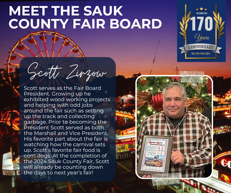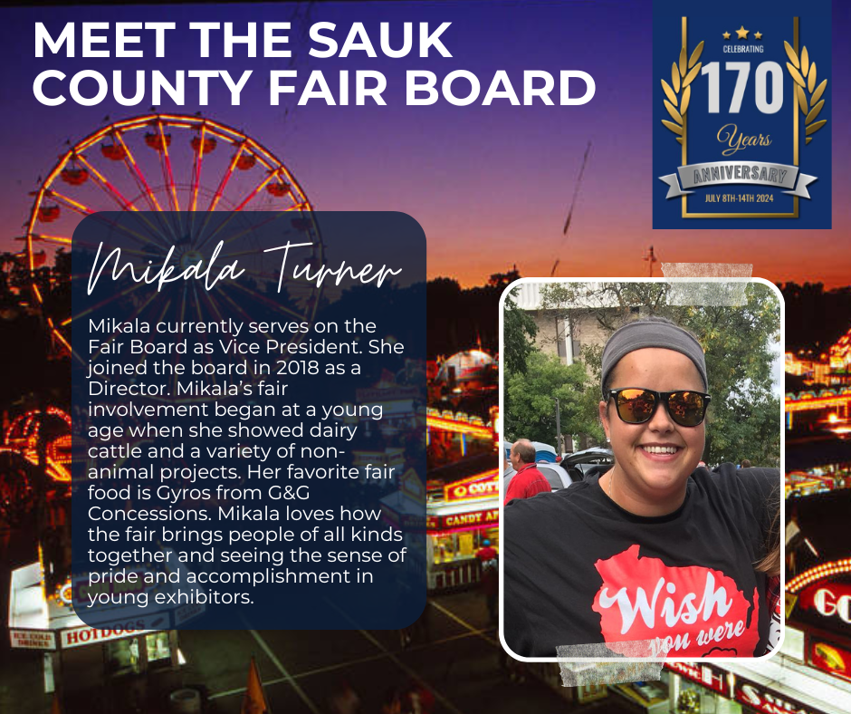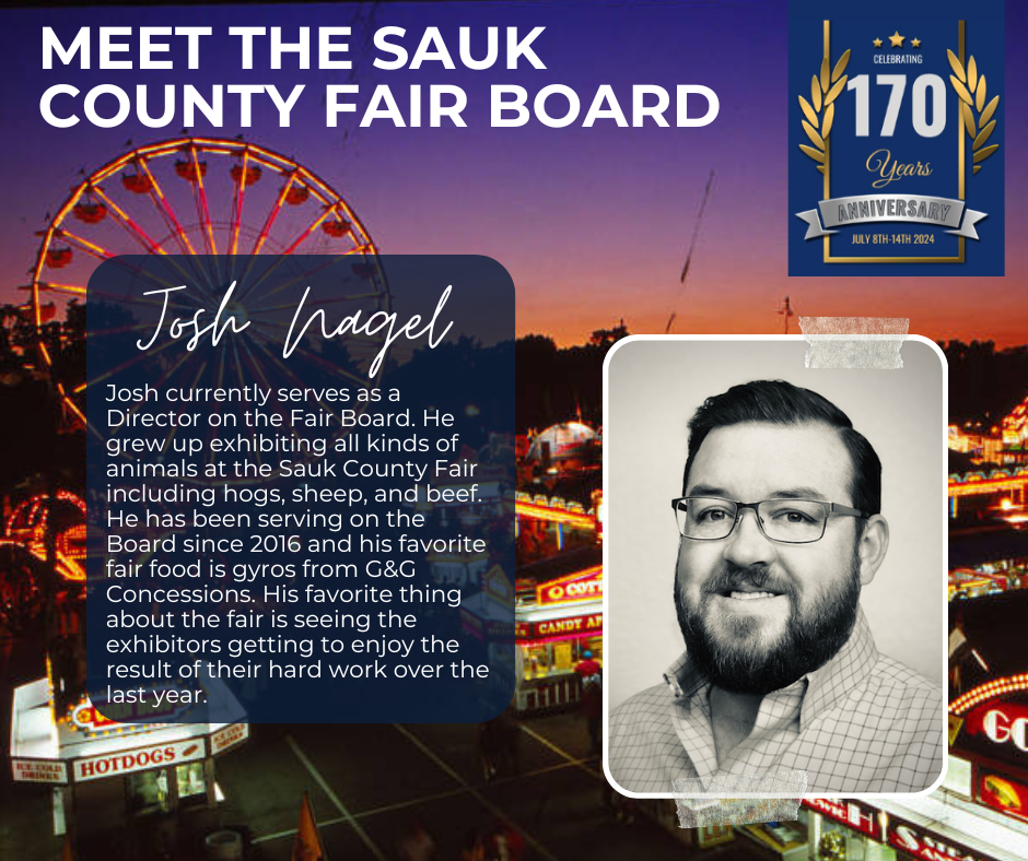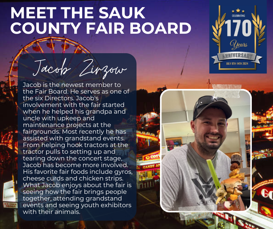 Officers serve 2-year terms, directors serve 3-year terms. Elected at the 2025 Sauk County Agricultural Society, Inc. Annual Meeting – Vice-President, Mikala Turner, 25′-27′; Secretary, Liz Cook, 25′-27′; Directors, Josh Nagel, 25′-28′ and Jacob Zirzow 25′-28′; they join officers and directors President, Scott Zirzow, 24′-26′; Treasurer, Angie Holt, 24′-26′; Marshall, Brady Neuman, 24′-26′; Directors: Ben Turner, 23′-26′; Beth Yanke, 24′-27′; Don Larsen, 24′-27′; and Tony Fluette, 24′-26′; to make up the 2025-26 Board. Jennie Kohlmeyer is the partnership/sponsorship coordinator.