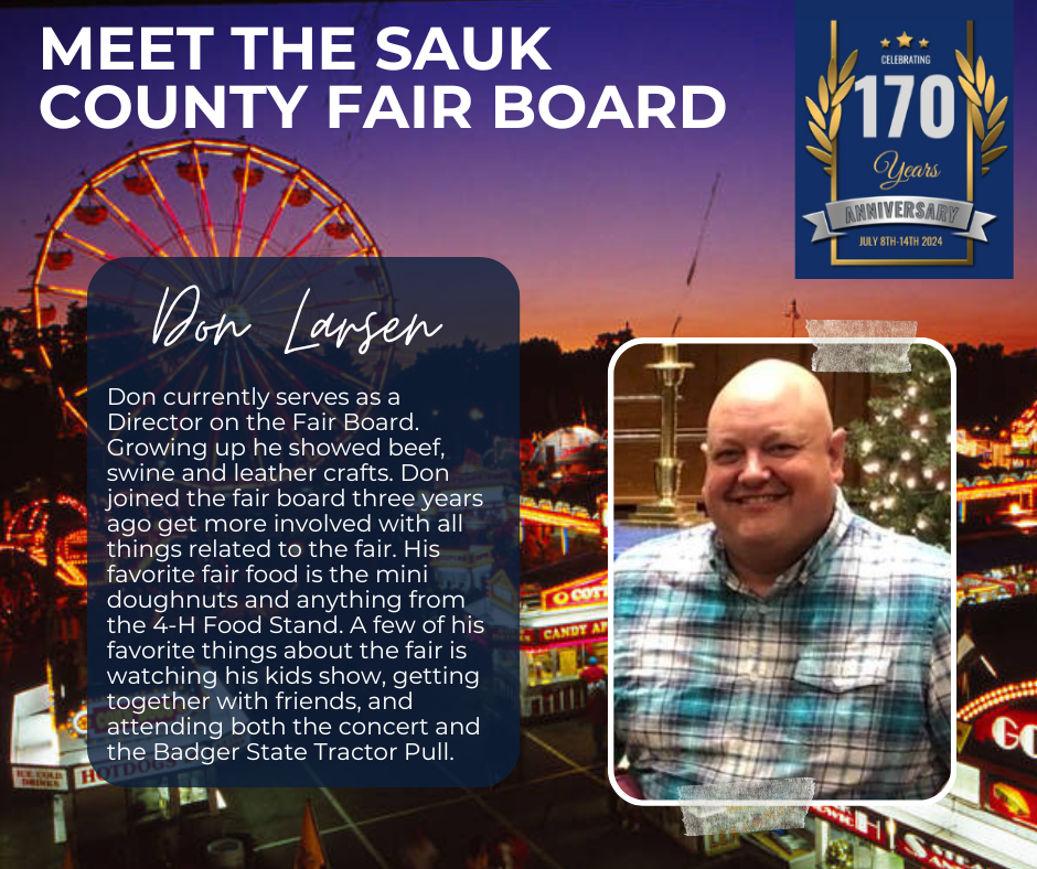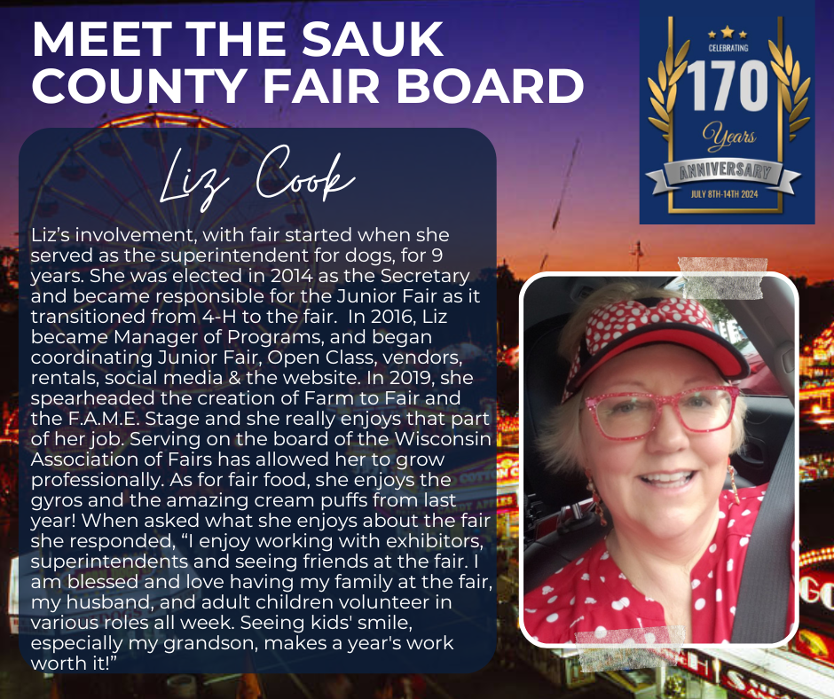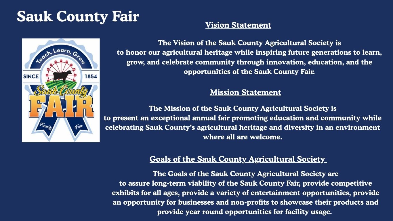 Sponsors, Donators, Vendors, Volunteers, Exhibitors and Family– The fairs’ success is dependent on many other factors. Most importantly our sponsors, donators, volunteers, exhibitors and family. Our sponsors and donators provide much needed funding for the fair’s programing. Our vendors provide revenue to the fair and provide benefits to our visitors. Our volunteers and exhibitors put a great amount of time and energy into making the grounds and programs run. Board member families didn’t necessarily sign up but embrace the volunteer opportunities to make the fair its best. We all work together to present an exceptional annual fair promoting education and community while celebrating Sauk County’s agricultural heritage and diversity in an environment where all are welcome.
